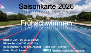 Das Frühschwimmen ist ein geschlossener Kurs mittwochs von 7:00 – 8:00 Uhr nur für Schwimmer. In diesem Zeitraum ist der Nichtschwimmerbereich gesperrt und nur das Schwimmerbecken zu Nutzen. Zum Frühschwimmen wird nur die Frühschwimmer-Saisonkarte anerkannt. Es gibt keine Ermäßigungen.